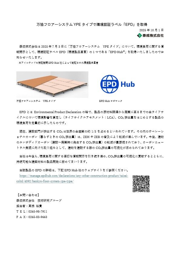 この度、当社製品である「万協フロアーシステム YPEタイプ」が製品の環境負荷情報を国際的な基準で透明性高く開示するEPD(Environmental Product Declaration:環境製品宣言)を取得いたしましたのでお知らせいたします。
