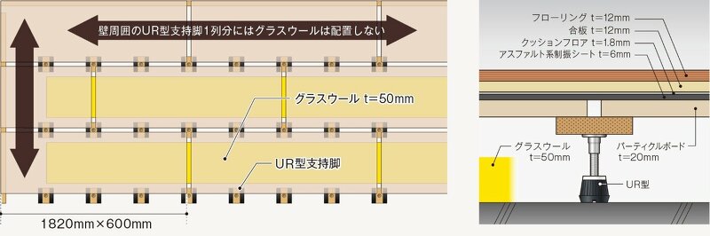 ㎡当たりの自重(重量)約38.9kg/㎡ ※床仕上げ高130mm想定 ※床仕上げ材及び防振システムネダ(際根太)は除いています。