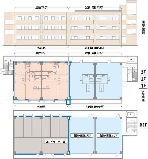 試験場と実際の現場では、床衝撃音遮断性能が大きく異なることが多いのが現状です。万協フロアーでは、現場により近い状況で性能確認を行うために、RCスケルトン状態の試験棟を備えています。スラブもRC、ボイドの2種類を持ち各種テストを行うことができます。万協フロアーは、実現場における性能確保を追究しています。