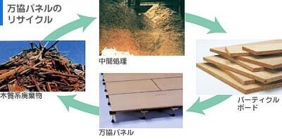万協フロアーが使用するパーティクルボードは、住宅などの解体材を再生した建材です。CO2を固定する木は、伐採されて材木となり、住宅などに活用され解体材となった後もCO2を固定し続けます。